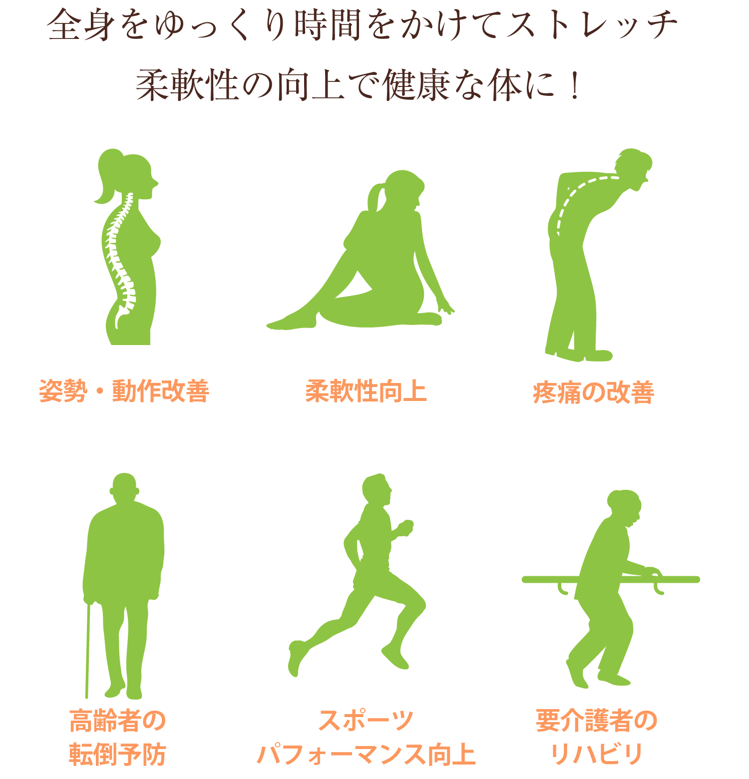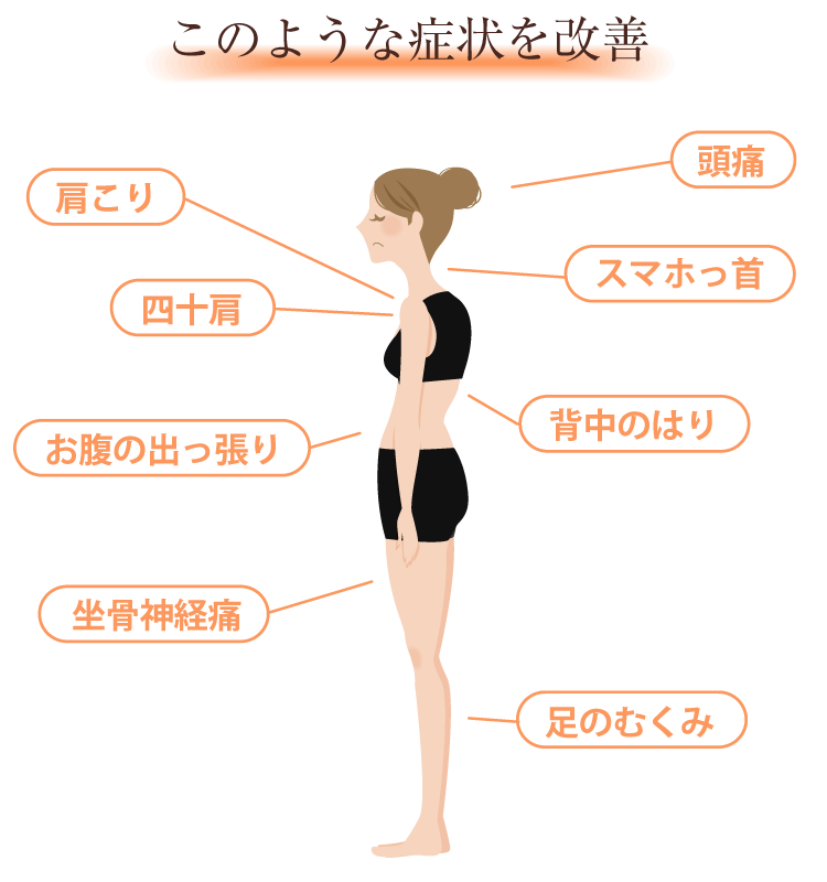 ハートストレッチは、肩・腰・横っ腹・股関節・お尻・太腿・膝など身体の様々な箇所の症状をのストレッチによって改善します。