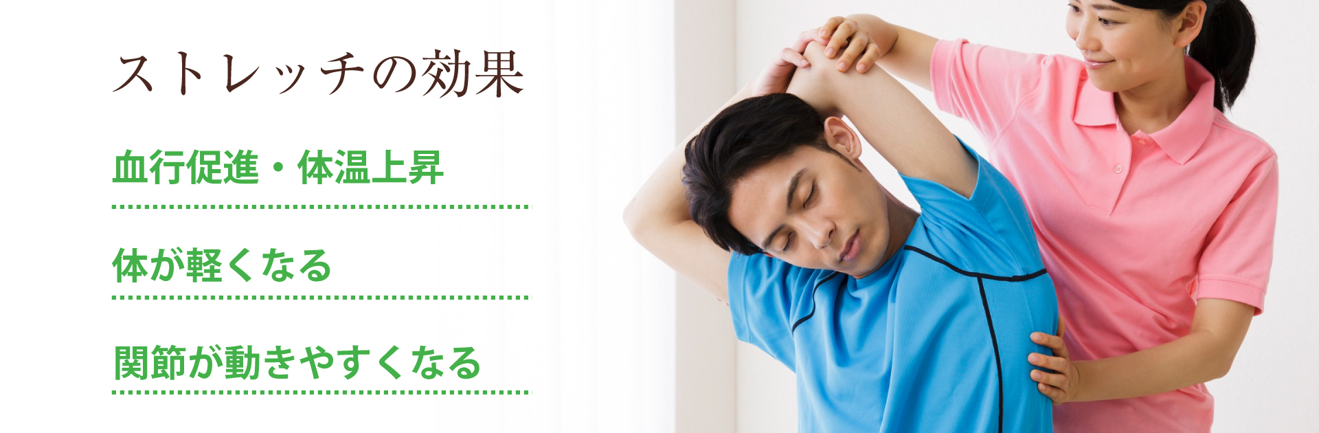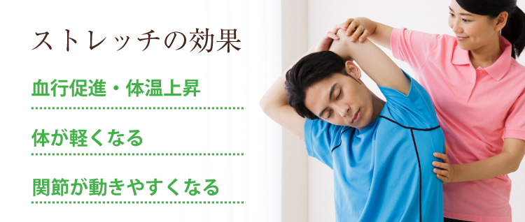 筋肉を伸張されることで血液循環がよくり、関節の可動域が改善されます。